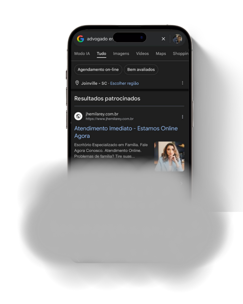 Seus anúncios aparecem para pessoas que estão procurando agora por termos como advogado trabalhista, advogado previdenciário ou advogado especialista na sua região. Ou seja, seu escritório é encontrado exatamente no momento em que o cliente precisa de ajuda jurídica.